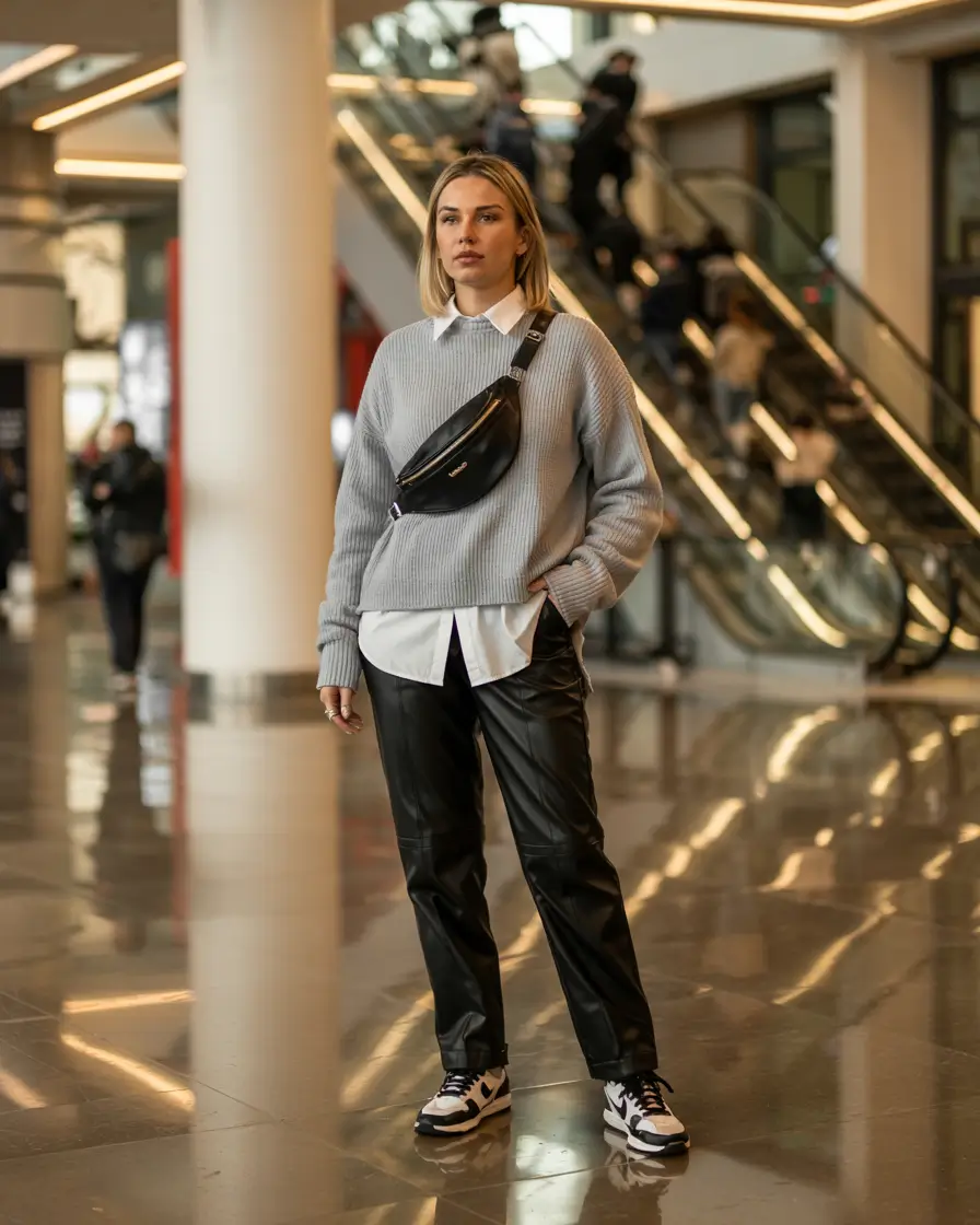 The initial glance is all boldness in movement a unified, yet casual outfit that is playing with surfaces and hues. I have a round gray sweater over a fresh white shirt with a nice pair of smooth fitted black leather pants and fashion sneakers on me. The crossbody bag sticks the appearance together and makes it casual but admittedly up to date – the sort of sneakers outfit brought about by ladies when they desire to appear dressed-up with out belonging to the overdone category.