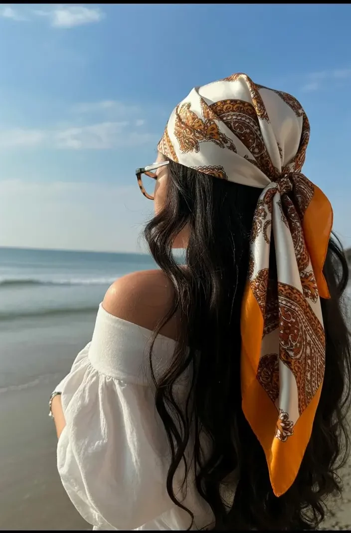 And then, something that feels almost cinematic. A lightweight head bandana in warm tones tied loosely at the back, flowing with the movement of the wind, paired with soft waves and an off-shoulder top—it’s the kind of look that feels like a memory in the making.